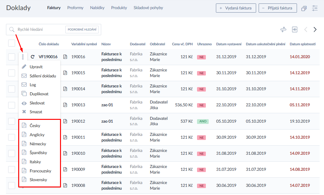 Potřebujete posílat faktury do zahraničí a anglická verze nestačí? Pošlete fakturu v jazyce, který potřebujete. Nově umíme faktury kromě angličtiny i v němčině, španělštině, italštině, francouzštině, portugalštině, slovenštině, holandštině, ukrajinštině, polštině nebo arabštině. Zobrazit nebo stáhnout správnou jazykovou verzi můžete z "akčního" menu: