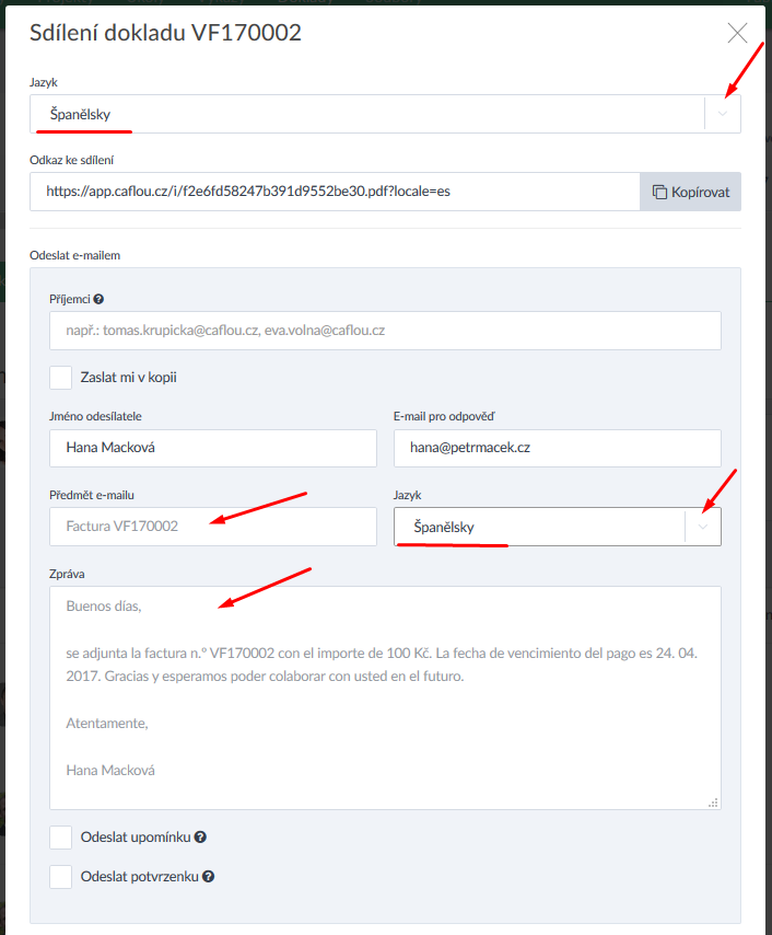 Z Caflou můžete fakturu také v daném jazyce poslat emailem, jazyk emailu je pak také ve vybraném jazyce:
