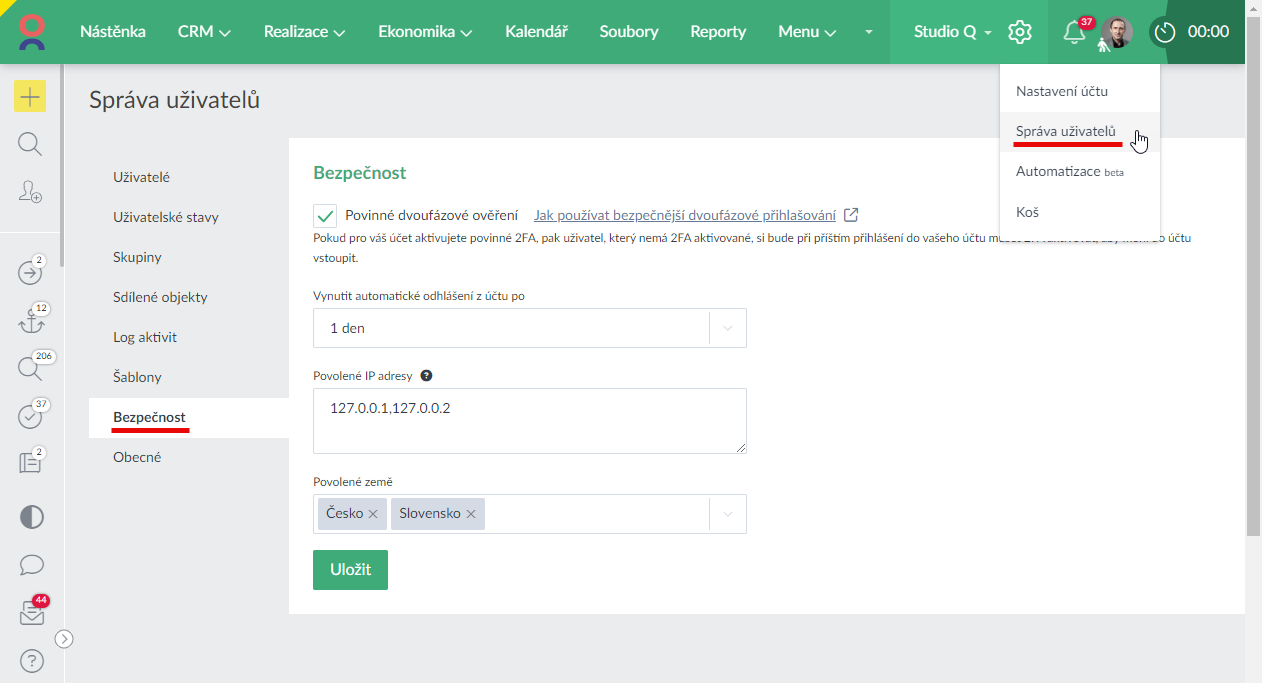 Ve Správě uživatelů, v sekci Bezpečnost má správce účtu k dispozici několik možností, jak zvýšit bezpečnost vašeho účtu.